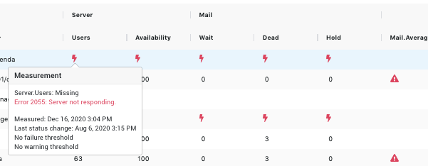 The measurements are grouped by categories, e.g. "Mail" or "Server", which further split into, e.g. "Wait" / "Dead" / "Hold" or "Users" / "Availability". Clicking on such a category, summarizes the individual measurements, as shown on the following screenshot for "Server":