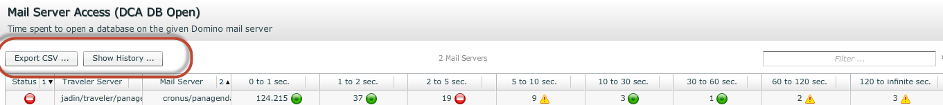 - Mail Server Access ( DCA DB Open): Histogram Information of how much time is spent to open a database on a given Mail Server