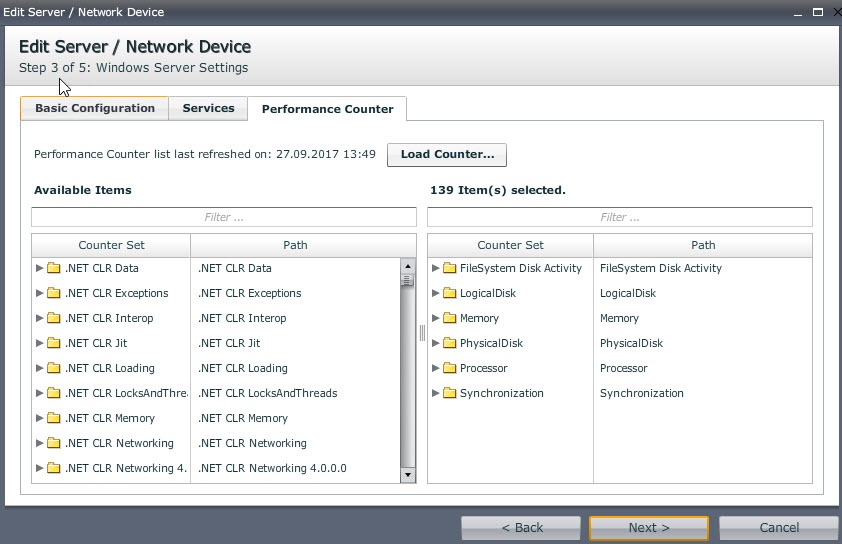 - click on "Load Services" and Load Performance counters" for retrieving all elements