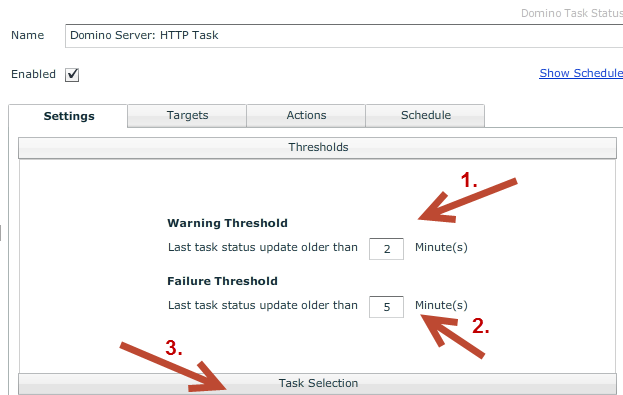 This Sensor definition will give you details about the http task “age”. A Task age for instance of greater 100 sec would/could indicate that the http task get stuck for whatever reasons. So if a Domino becomes unresponsive the task age increases.