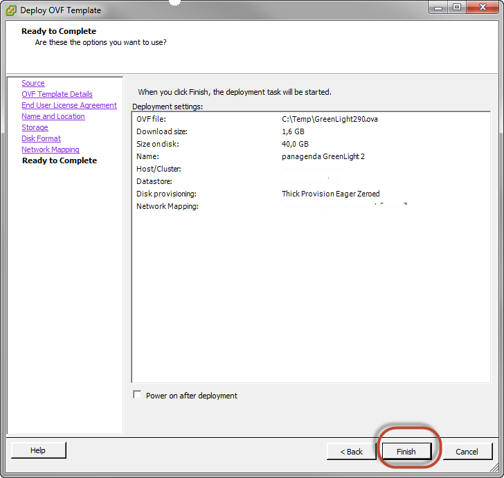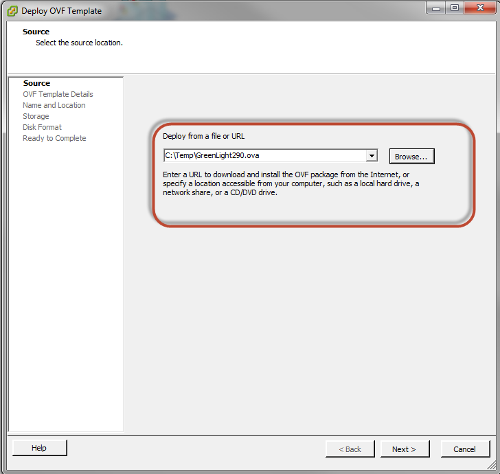 - Source: Specify the path to the GreenLight OVM file – for example: C:/Temp/GreenLight290.ova