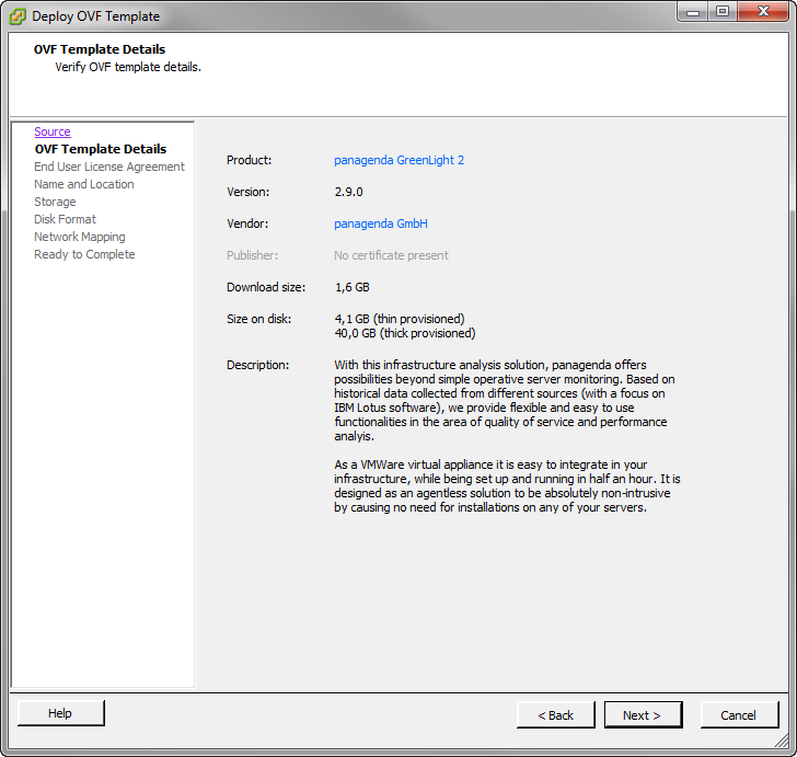 - OVF Template Details: This step holds information about the GreenLight version you are about to deploy. Click on Next to continue.