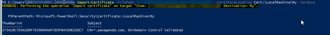 - Import-Certificate -FilePath "<path to certificate>" -CertStoreLocation Cert:\LocalMachine\My -Verbose
