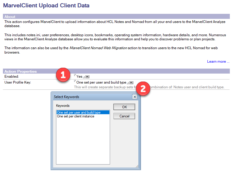 The MarvelClient Upload Client Data Action in the Domino Directory updates Notes client Analyze and Nomad Web Migration data into your MarvelClient database every time end users login to and shutdown their Notes clients. IMPORTANT The MarvelClient Upload Client Data Action requires a saved and properly configured Simplified Installation document, so that it knows where to find the Analyze database!