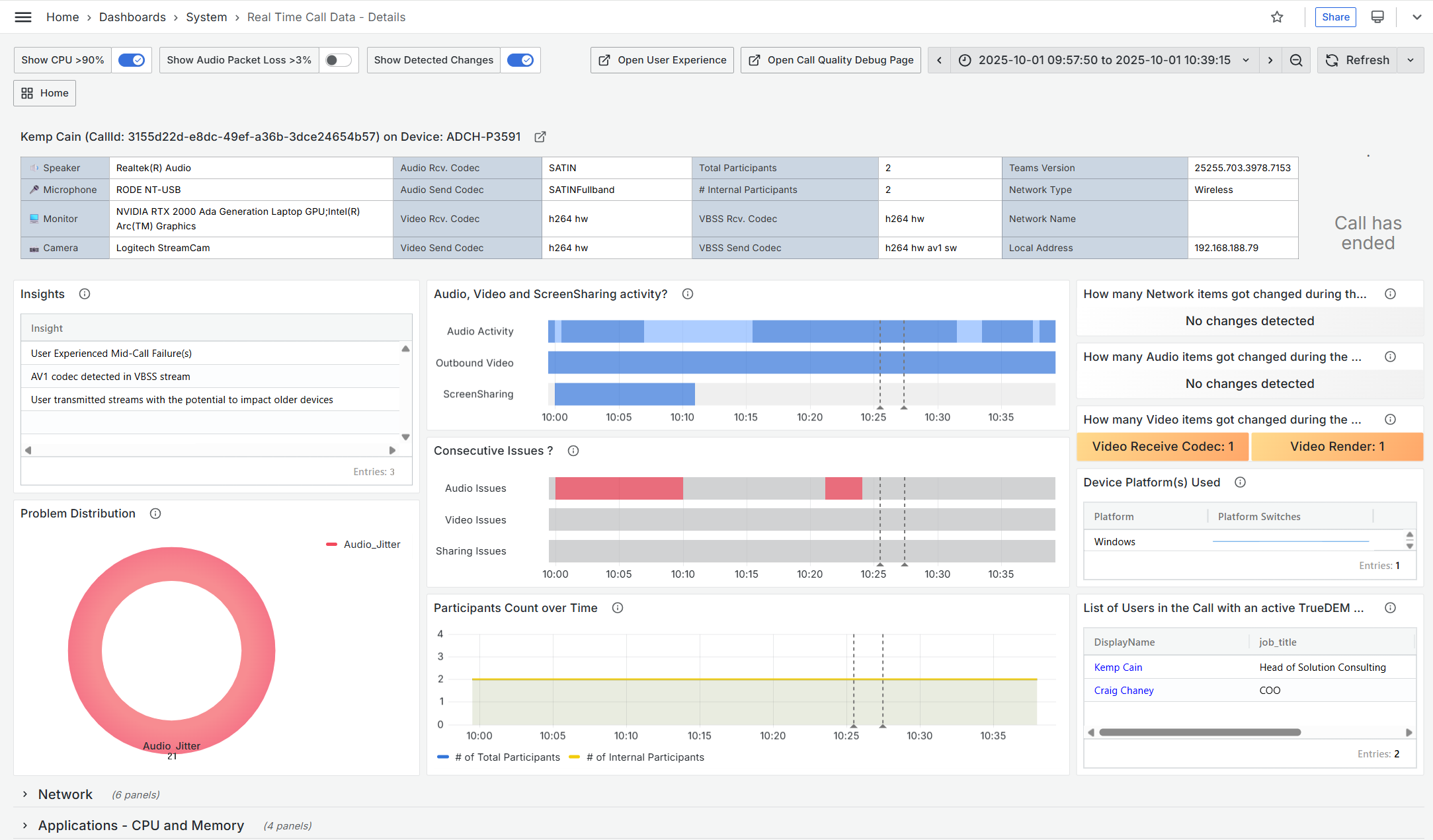 At the top you will have insight into the third party devices used, Teams version, Codec and network type. Below you’ll find information about detected Insights, a donut chart showing the issues detected and how many intervals of 30 seconds thes occured during the call.