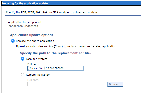 3. Select Replace the entire application. Here you can either upload the file (Local file system) or refer to a path on a application server (Remote file system):