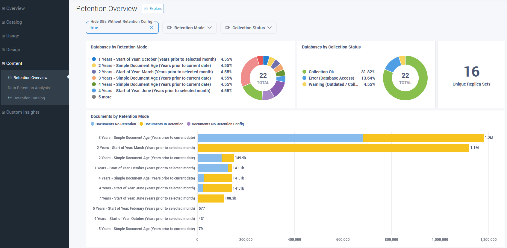 - The "Retention Overview" dashboard provides a summary across different retention settings and how many documents in each category are in an outside retention