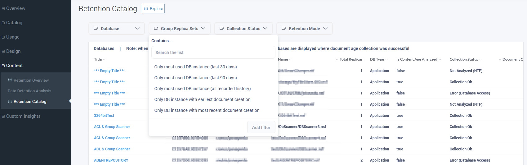 Filtering by "Collection Status" also provides a quick way to understand which databases may have issues with content scanning