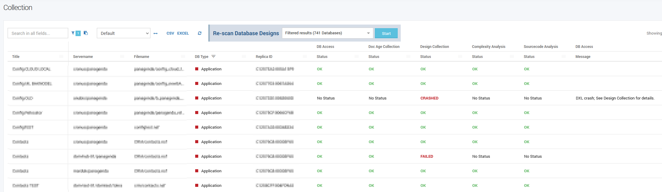 - (Re-)Collection can be triggered manually for one or more databases via the menu item [Settings] → [Design analysis status]. Note: if code analysis is licensed, using this option this will also trigger a re-collection and re-processing of design data. This may take several days, depending on the amount of databases to process. The regular scheduled scan on Saturday will only re-collect design data if changes in DB design occurred.