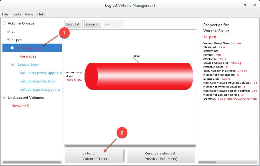 - Open the Logical View on the left hand side, select Physical View and click Extend VolumeGroup: