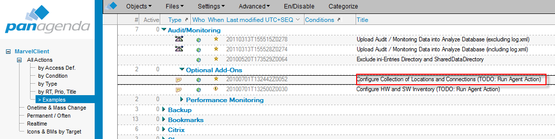 - Go to the Example view in the MarvelClient Config database, copy the Audit/Monitoring - Optional Add-Ons - Configure Collection of Locations and Connections (TODO: Run Agent Action) action and paste it into any other action view.