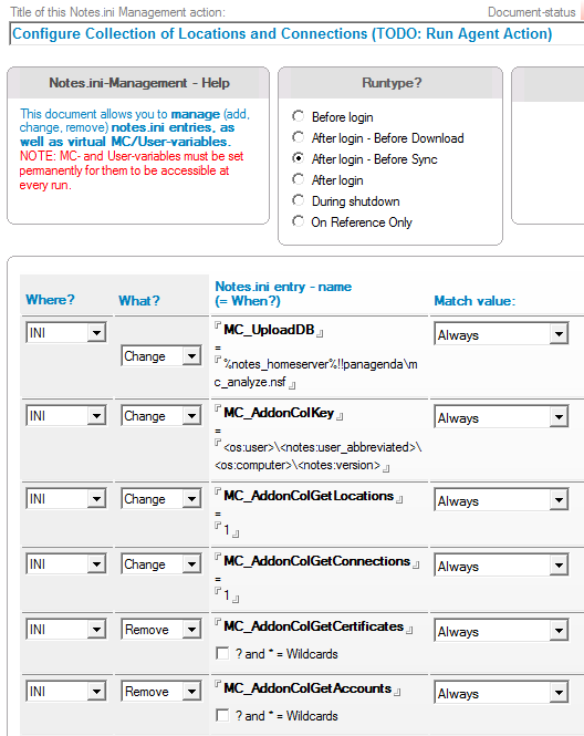 After setting the respective ini entries with the config action above, the agent will reset them back to "not set" (=remove them from notes.ini) as soon as it has run successfully.