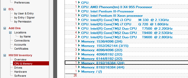 The following screenshot shows sample HW/SW inventory results for CPU and memory details: