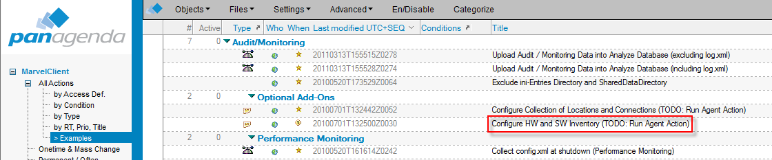 - Go to the Example view in the MarvelClient Config database, copy the Audit/Monitoring - Optional Add-Ons - Configure HW and SW Inventory (TODO: Run Agent Action) action and paste it into any other action view.