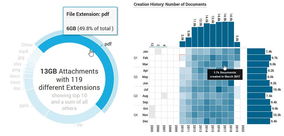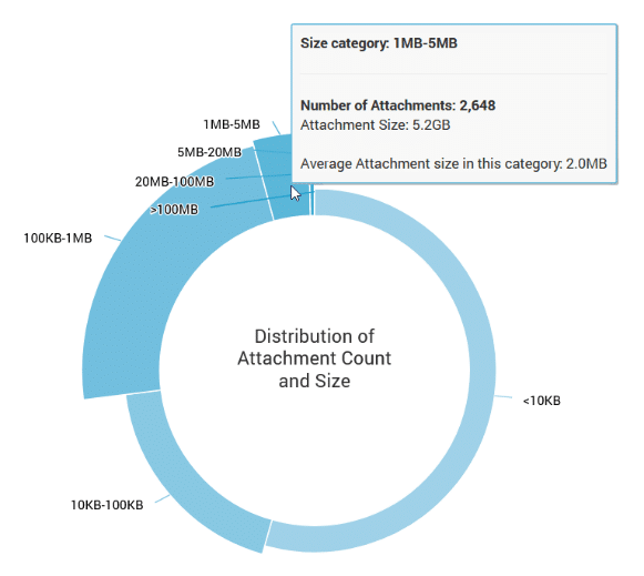 iDNA solves this challenge and makes Domino data analysis relatively easy. After scanning all application content and collecting the details within the datastore, the system aggregates the information and provides the analytics using insightful reports. As seen in the separate screenshots below, iDNA will provide a complete overview of the number of all file attachment types and their sizes for an accurate data migration estimate.